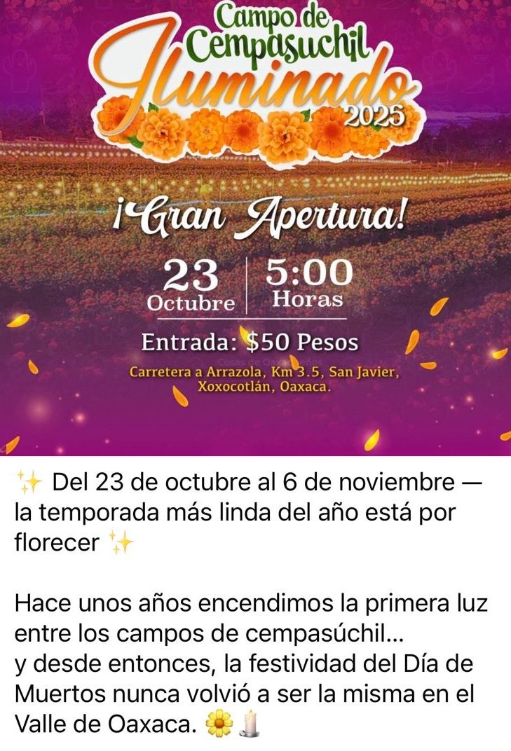 October 27: From October 23 to November 6, illumination of the fields of marigolds “cempasúchil”. Location: Carretera a Arrayola, km 3.5, San Javier, Xoxocotlan.