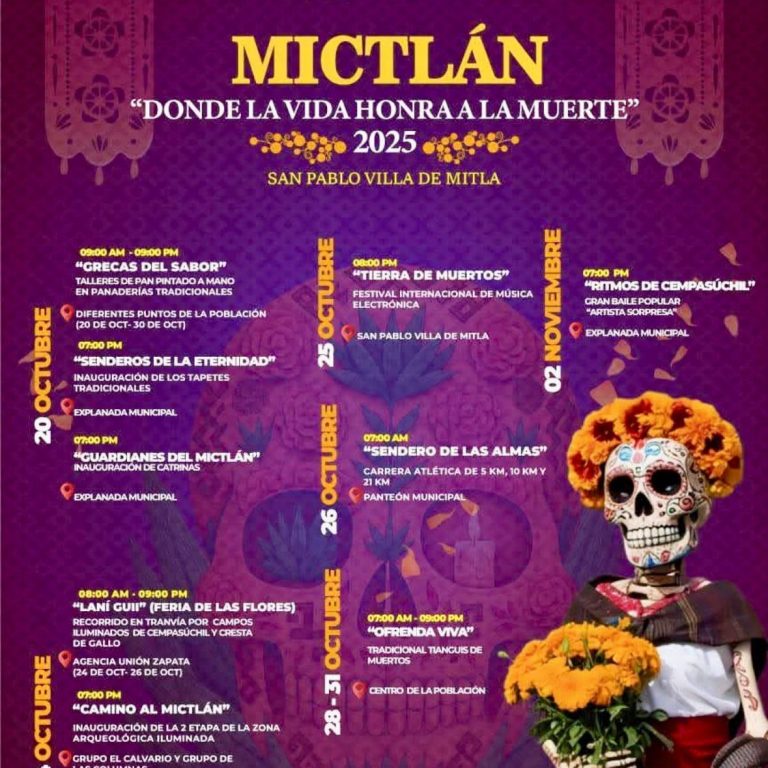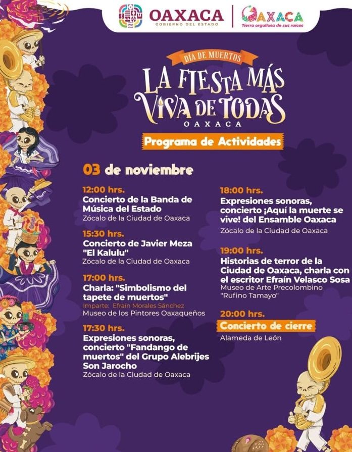 November 3: Villa de Mitla (Oct. 31–Nov. 3): Known for sand carpet contests, cultural presentations, and a grand closing parade on Nov. 3.